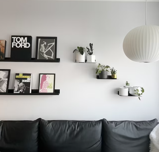 Sleek metal shelves with a robust matt black powdercoated finish will allow you to organize and declutter your space whilst maintaining a cool and contemporary spatial vibe.